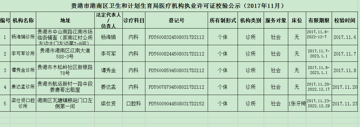 贵港市港南区卫生和计划生育局医疗机构执业许可证校验公示(2017年11月)