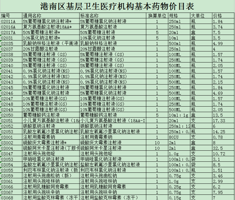 港南区基层卫生医疗机构基本药物价目表