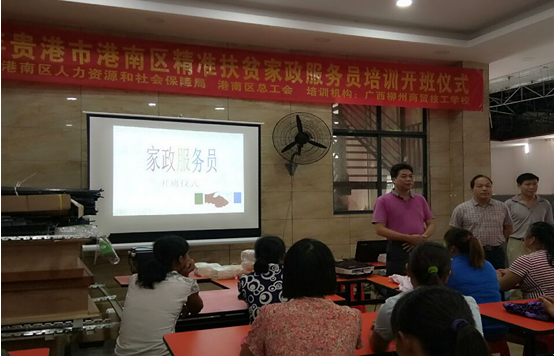 2017年7月11日,港南区在桥圩镇组织50多名贫困人员开展港南区精准扶贫家政服务员培训班,区总工会、区人社局领导参加了培训班开班仪式。