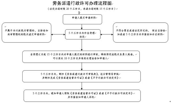办理时限:根据《劳务派遣行政许可实施办法》规定,许可机关应当自受理之日起20个工作日内作出是否准予行政许可的决定。20个工作日内不能作出决定的,经本行政机关负责人批准,可以延长10个工作日,并应当将延长期限的理由告知申请人。 申请人的申请符合法定条件的,许可机关应当依法作出准予行政许可的书面决定,并自作出决定之日起5个工作日内通知申请人领取《劳务派遣经营许可证》。